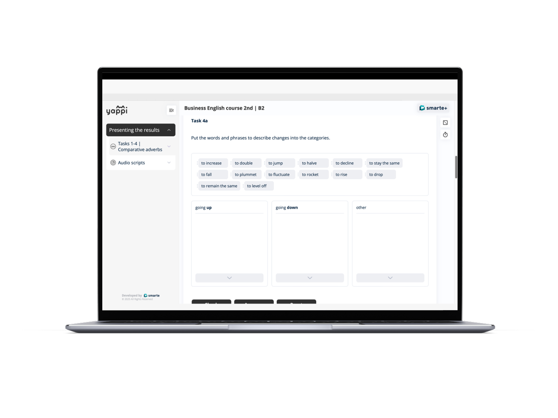 Тема презентування інтегрована у курс бізнес-англійської школи Yappi Corporate. Студенти рівня В2 (Upper-Intermediate) вчаться представляти результати досліджень. Вони слухають приклади виступів та опрацьовують цільовий вокабуляр, який допоможе говорити про тенденції, зміни та результати. Ось кілька лексичних одиниць на цю тему:
